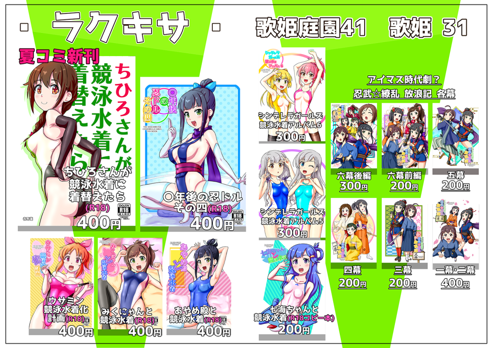 歌姫庭園41・お品書き 2025年9月15日に開催される歌姫庭園41にサークル参加します!サークル配置場所は歌姫31「ラクキサ」です。新刊はありません・・・夏コミで売り切れた「ちひろさんが競泳水着に着替えたら」を再印刷しました。 2025-09-14 投稿先 同人 ← 過去の投稿へ 次の投稿へ → コメントを残す コメントをキャンセルメールアドレスが公開されることはありません。 ※ が付いている欄は必須項目ですコメント ※ 名前 ※ メール ※ サイト